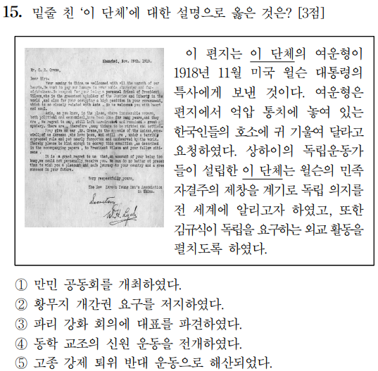 여운형은 미국 우드로 윌슨 대통령 특사에게 위 편지를 보냈습니다. 이 편지는 독립청원서를 전달하는 흐름으로 이어졌습니다. 여운형은 1918년 신한청년당을 조직하였습니다. 이""단체""는 신한청년당입니다. 여운형은 대한민국의 독립을 알리고자 파리강화회의가 열리는 프랑스로 대표를 파견하기도 했습니다. 그러나 큰 성과는 보지 못했습니다.